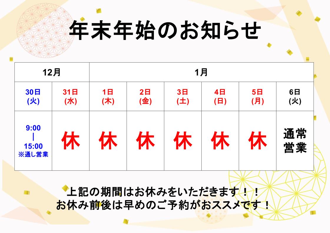 【年末は30日(火)15時まで・年始は6日(火)から営業】